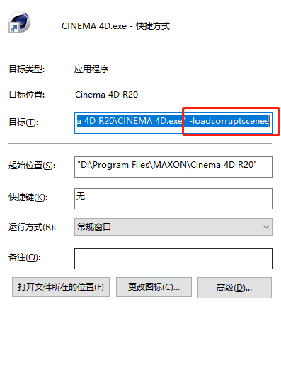 摘要: 在保存文件时,C4D崩了,导致文件损坏首先,在根目录下找到C4D程序,然后右键创建一个快捷方式再然后,打开这个快捷方式的属性,在目标这一栏的后缀加上这一串东西:-loadcorruptscenes注意:前面的小横线有个空格最 ...