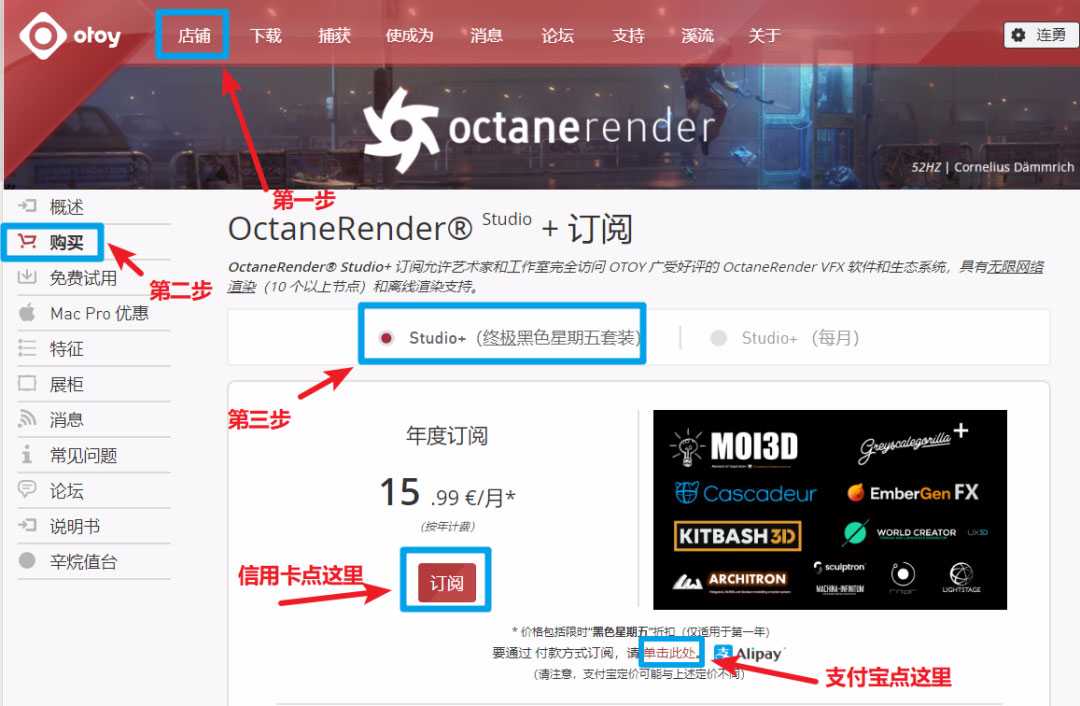 先说今年的octane渲染器价格,oc用户多了就飘了,没错,今年octane渲染器它涨价了! 月供折算人名币178元(以后都这个价格) 价格参考: 黑五前:1480人民币(这是以往得价格了,现在oc费用涨了!!!) 黑五期间:信用卡1431(1年+7天)/支付宝1414(一年) 前后没有什么明显优惠,但是!如果常用还是建议大家直接订阅一年的吧 Octane订阅流程: 第1步进入官网 网址:https://home.otoy.com 然后点击右侧的登录/注册 在C4D里面用来登录oc的账号就是这个网站的登录账号 注册的时候需要吃碗佛跳墙 推荐使用谷歌浏览器,右键自带翻译,非常方便 第2步 这里演示的是信用卡支付,支付宝的话看第7步 依次点击 店铺——租——订阅 第3步 点击订阅后,会弹出一个选项,选好了点击继续 第4步 确认订单一些信息,右上交接受都勾选,然后点击继续 第5步选择付款方式,我用的visa信用卡 只要你的信用卡带有以下三种标识,都是可以使用的 第6步支付 没有添加卡的添加卡就行了 信用卡支付的都是要取消自动续订的 第7步,支付宝购买 依次点击 店铺——租——工作室——红字“点击此处” 第8步 点击年/月切换订阅方式,然后点击购买 第9步 确认订单一些信息,右上交接受都勾选,然后点击继续 第10步 选择支付宝付,然后扫码付款即可,支付宝不需要取消自动续订!!! 第11步 下载插件 官网下载的都是英文,需要汉化的可以自行百度,淘宝,魔顿上去找汉化的 第12步登录 账号就是oc官网你注册登录的那个账号 切换设备 需要先在登录的设备上退出,再去另外一台设备登录 账号被锁 在官网订阅里点击开锁 一个月只有两次,超过了就要给官方发邮件 官方联系方式license@octanerender.com 解绑范文 Hello friends! My account cannot be logged in due to a system crash, and the number of unlocks has been exhausted. Can you help me recover the unlock? My account: 123456789@qq.com My email:123456789@qq.com 最后两项换成你自己的账号和邮箱就行了 正常36小时内就解决了 |