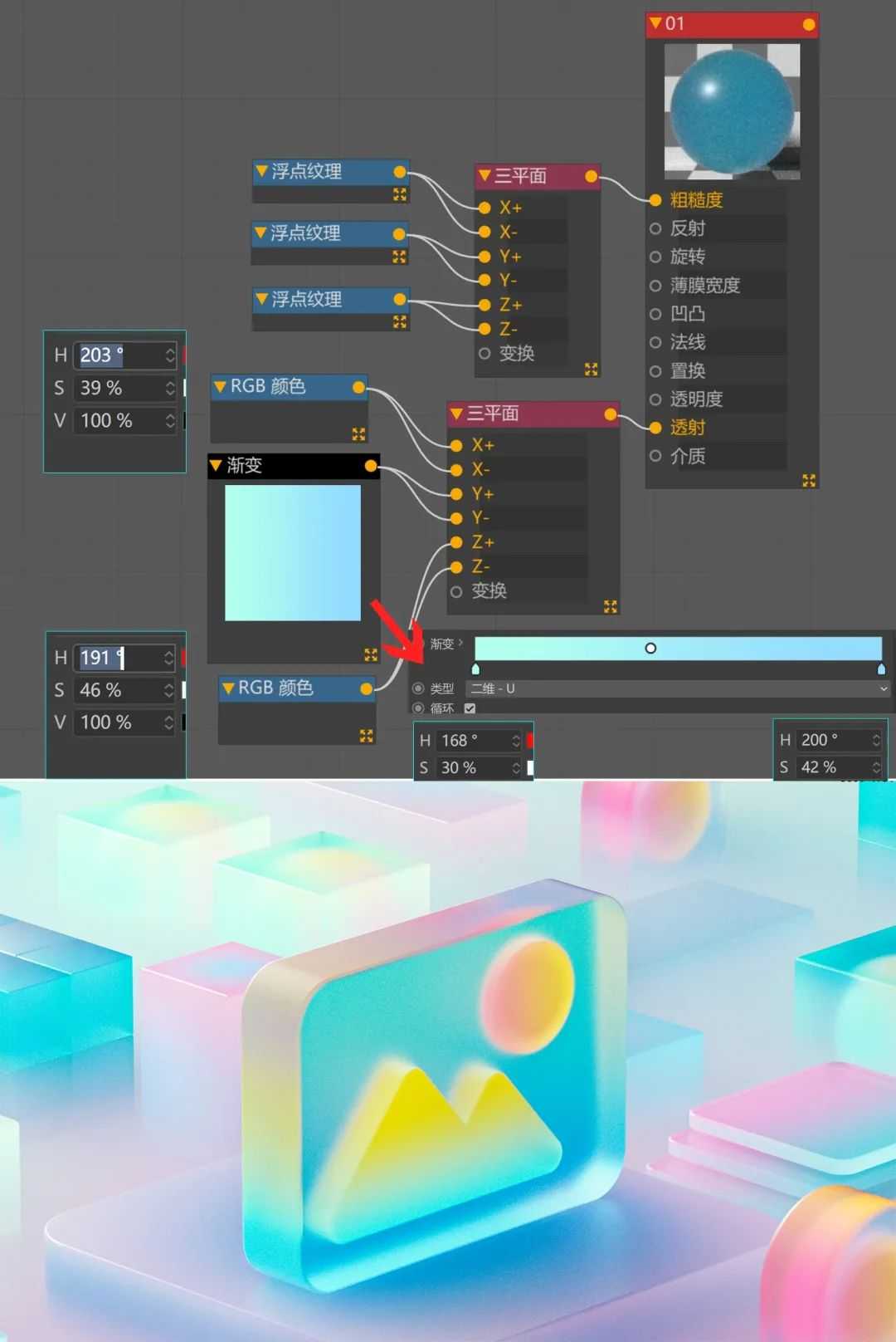 今天给大家带来的是微软风3S材质的制作,以中间的方形图标作为本次的讲解 先讲圆形部分,左下角的山形图案方法类似 第一步 新建玻璃材质将粗糙度的浮点改为0.5,传输的颜色改为100% 第二步 1.进入节点编辑器,新建散射介质,密度:0.1,体积步长:4(不要记参数,根据实际效果来定。 2.将纹理发光连给发光,纹理发光勾选表面亮度,强度:0.5 3.新建渐变(颜色参数见篮筐)连给纹理发光-纹理、散射介质-吸收、以及透射 第三步 点击材质球将透射方式改为平直,切换为纹理模式调整渐变的位置,得到下图的效果 接下来制作比较重要的立方体部分的3S材质 第四步 新建玻璃材质,指数调为1.5反射会更强一些,传输的颜色给100%,公用-伪阴影勾上,得到下面的渲染效果。 第五步 新建一个三平面,可以用浮点纹理分别控制XYZ轴三个方向的粗糙度。浮点纹理为0没有粗糙度,浮点纹理为1粗糙度最大,浮点纹理数值作为参考,得到下面的渲染效果。 第六步 同样的原理,这里用颜色控制不同方向的颜色,可以用单独的颜色,也可以用渐变颜色控制,得到下面的渲染效果,这里会有些暗,接下来继续 第七步 新建一个散射介质、纹理发光,按下图进行连接,参数如下,得到最终的渲染效果 |